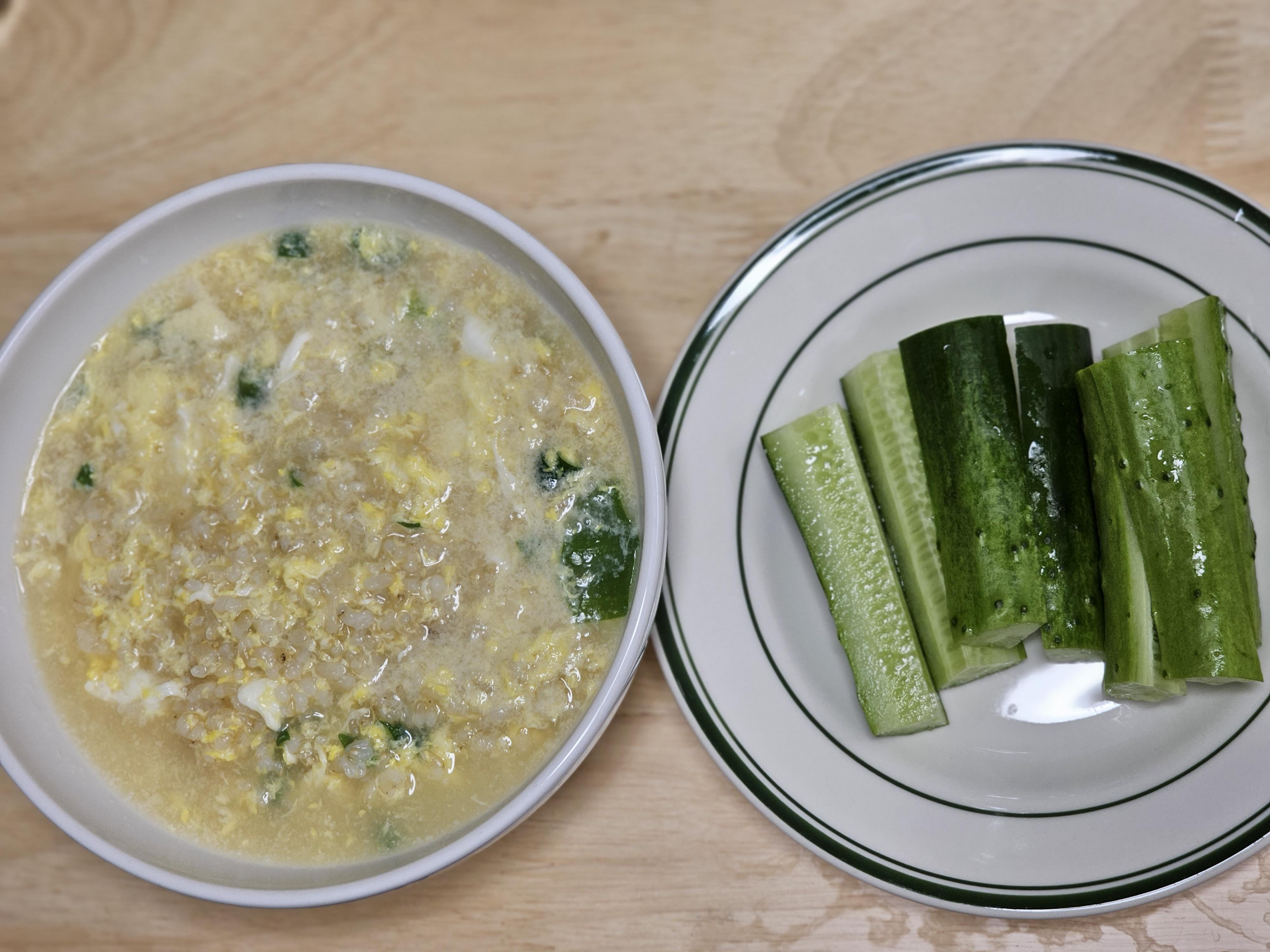 오이 한개를 먼저 먹고 그다음에 계란죽을 먹었습니다.